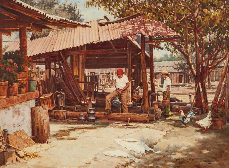 To the unaided eye, this piece appears to be in fair condition. There is extensive unstablized craquelure, cupping, and paint loss throughout the entire piece. The back side of the piece reveals signs of thorough water damage. There are no signs of restoration. The piece is framed in a semi-ornate antiqued gold frame with a linen liner. The frame shows signs of normal wear and is separating in the top corners. The linen liner is discolored. Plate: Coppersmith, Mark Haworth Verso: [handwritten on back of linen, bleeding from water damage] All Rights Reserved by Artist (artist's signature) © 87