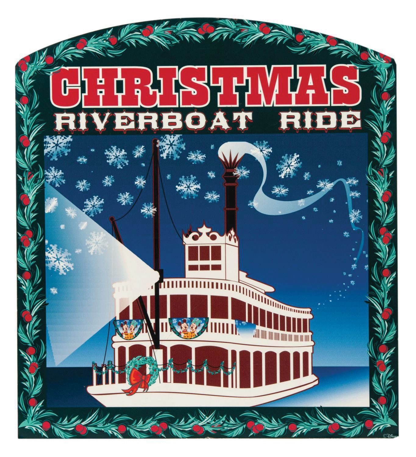 (Disneyland, 2000s) A Christmas Riverboat Ride sign displayed during a holiday-themed overlay of "the queen of the river." The decks of the Mark Twain are embellished with garlands, wreaths, and festive bunting while snowflakes fill the air in this sign produced for the Disneyland Resort. Measuring 20"X18", the pvc core sign with screen printed graphics displays in very good condition exhibiting minor wear due to intended Park display.