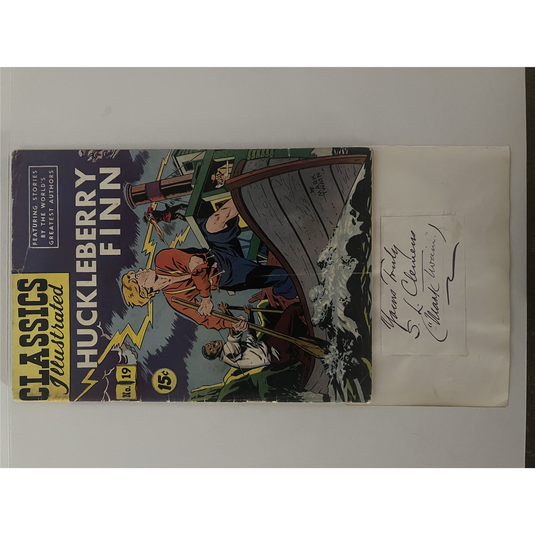 Mark Twain original signature signed as S.L. Clemons and Mark Twain. Comes with Huckleberry Finn comic book. 2x3 inches