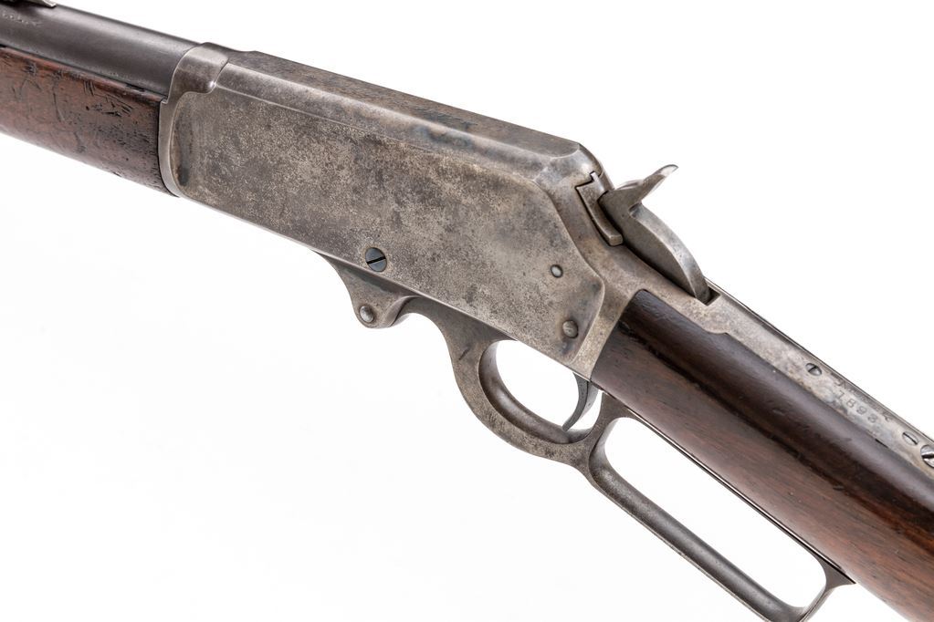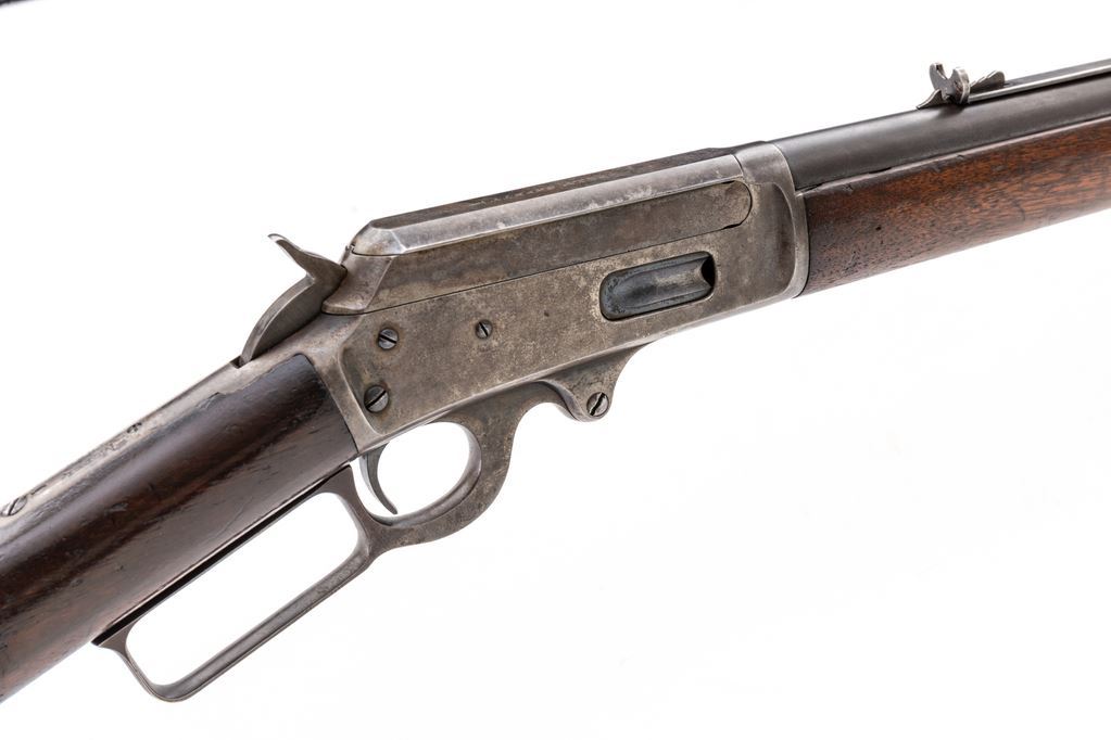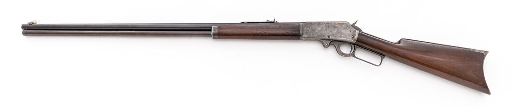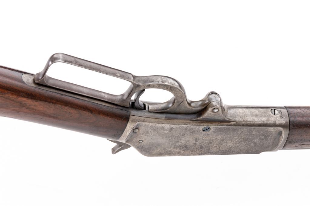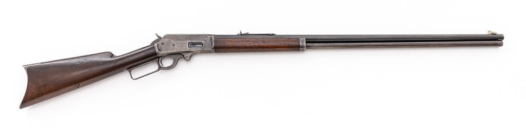 Marlin Model 1893 Lever Action Rifle, #210250, .38-55 CF cal., 30" round barrel with large German-silver blade front and buckhorn rear sights, marked with maker's name, address and 1887-89-93 patent dates on top, caliber at breech, "Special Smokeless Steel" at left, has full-length magazine tube below; receiver has right-side loading and ejection, loop operating lever, is marked "Marlin Safety" on top flat and "Model/1893" at upper tang. Varnished walnut forend has a steel nosecap, matching buttstock with crescent steel buttplate. Mfg'd ca. 1900. Condition is fine retaining approx. 85% thinning barrel blue, mag tube 10% blue with smooth brown patina; receiver, lever, hammer and buttplate show softly-mottled case colors but have mostly silvered-out. Stocks are sound with pleasing color, general use marks, shallow gouge at belly of buttstock, most original varnish. Edges and markings are sharp. Action is crisp, bore is bright with light frosting and deep spiral rifling. Est.: $800-$1,200. (C&R)