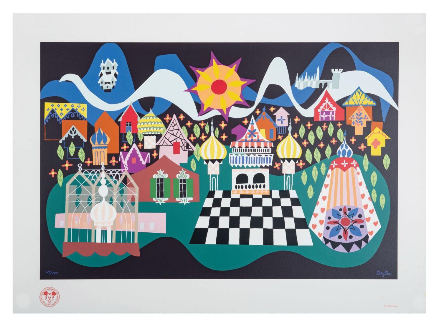 (Disneyland, c.2000s) A high quality serigraph print of Mary Blair's "World of Dreams" concept artwork for It's a Small World. Mary Blair's color study of the It's a Small World Show Building facade has been recreated as a high-quality "Walt Disney Imagineering" collection serigraph for The Disney Gallery. Measuring 25.5"x35", the print is numbered "120/240" and features Blair's facsimile signature in the lower-right. It displays in very fine condition.