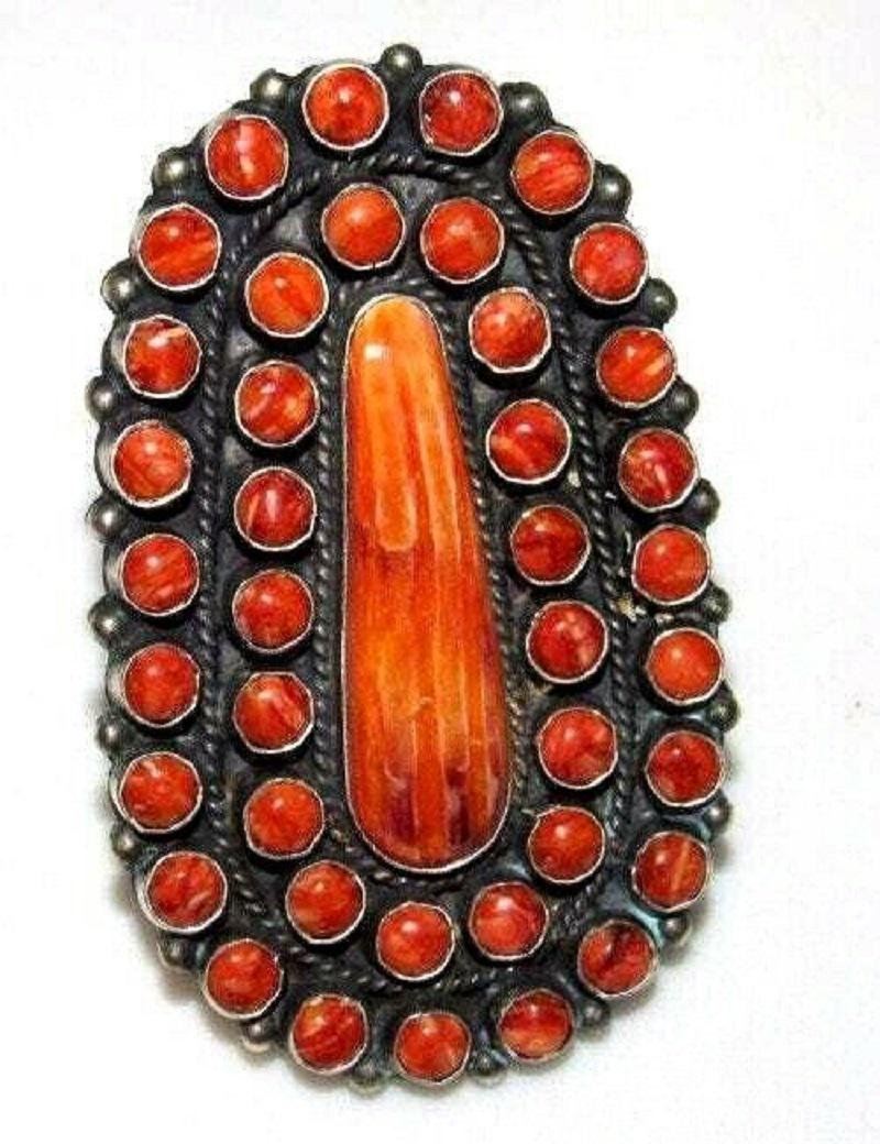 Exceptional, one of a kind, massive Navajo sterling silver and spiny oyster statement cluster ring size 8. Impressively measures 3" tall on the front. Marked sterling, signed by the artist. Exceptional statement example of wearable Native American art to add to any jewelry collection!