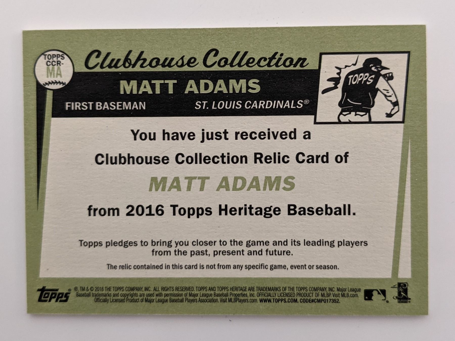 Matt Adams Baseball Trading Card with Game-Used Jersey Swatch - Topps Heritage Clubhouse Collection #CCR-MA 2016