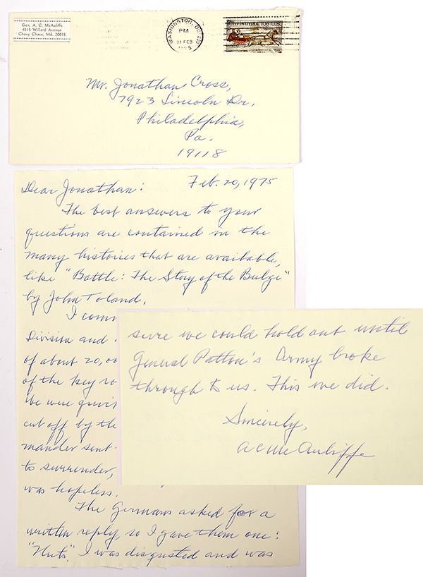 "Dear Jonathan: The best answers to your questions are contained in the many histories that are available, like 'Battle: The Story of the Bulge' by John Toland. I commanded the 101st Airborne Division and attached troops, a force of about 20,000, charged with defense of the key road center of Bastogne. We were quickly surrounded and cut off by the Germans. Their commander sent me a written demand to surrender, saying our situation was hopeless. The Germans asked for a written reply, so I gave them one: 'Nuts.' I was disgusted and was sure we could hold out until General Patton's Army broke through to us. This we did. Sincerely, A. C. McAuliffe." Very fine. Accompanied by the transmittal envelope, addressed in McAuliffe's hand.