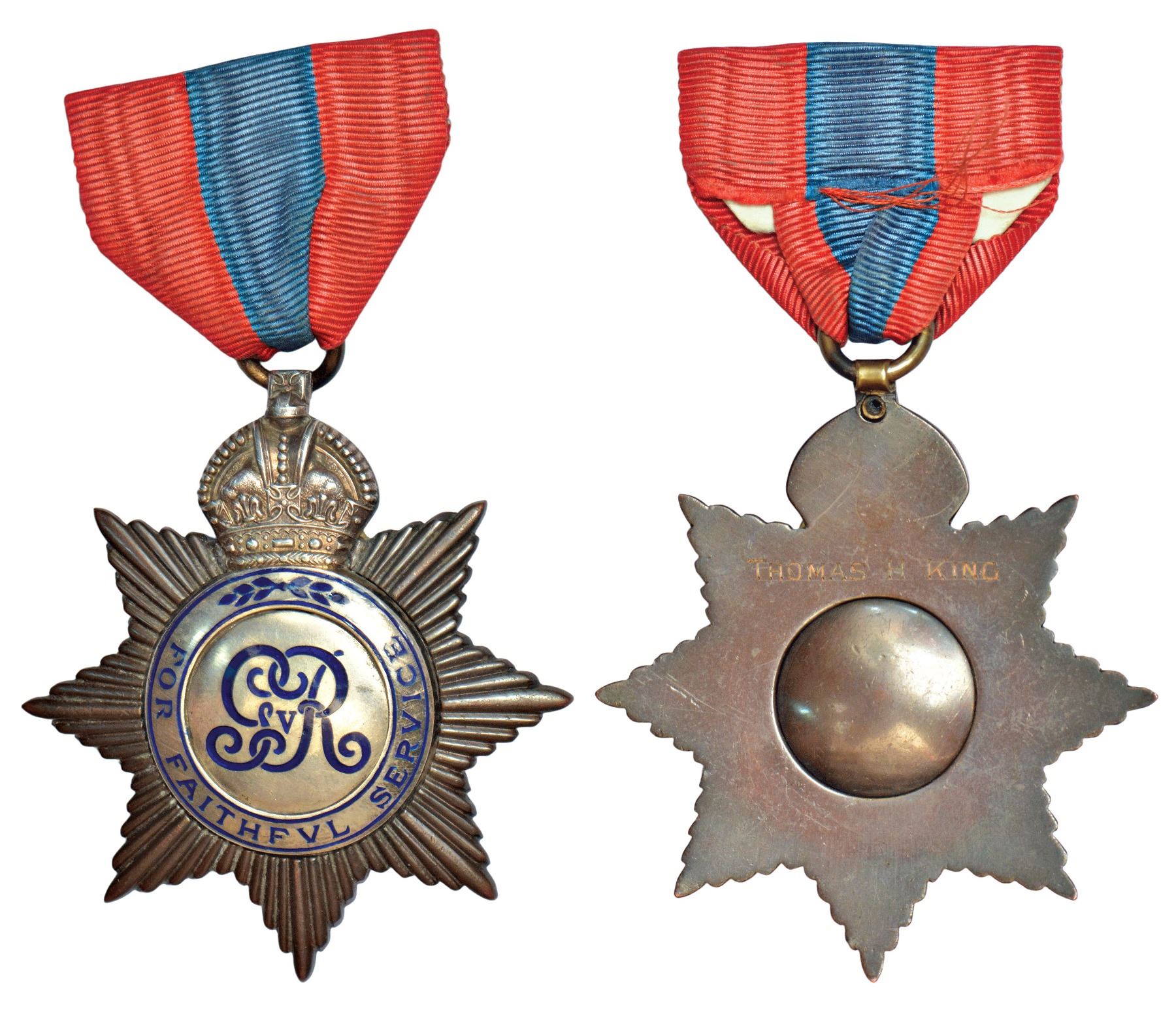 George V, Imperial Service Medal, 1911-1920 AD, silver, 44.09g. Obv: GR V monogram in center around legend FOR FAITHFUL SERVICE in blue enamel. Rev: Awarded to THOMAS H. KING, MYB 29. With suspension ring and ribbon,