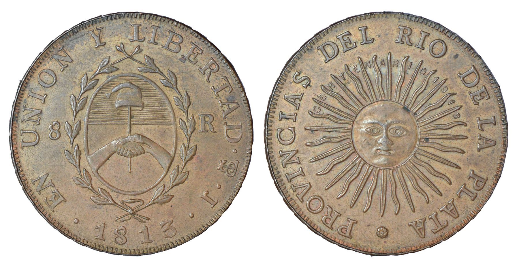 Medals: Argentina, Centennial copper medal, struck in celebration of the 100th anniversary of Argentine coinage; AD 1813-1913, 'PTS J' mintmark, 25.11g. Obv: Radiant sun with face; legend around. Rev: Arms within wreath; legend around.