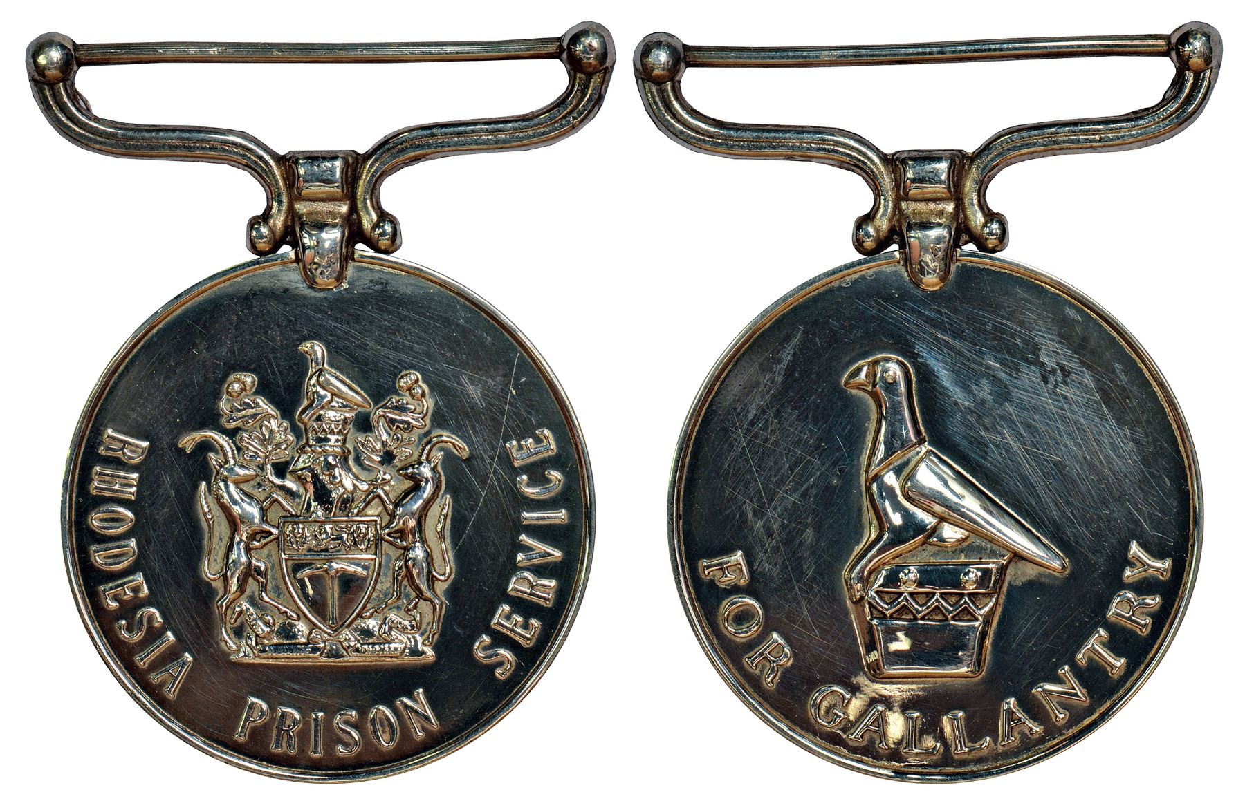 Rhodesia, prison medal for gallantry (RPM), silver 32.15g. Obv: Coat of arms of Rhodesia with legend RHODESIA PRISON SERVICE. Rev: Zimbabwe bird with legend for GALLANTRY