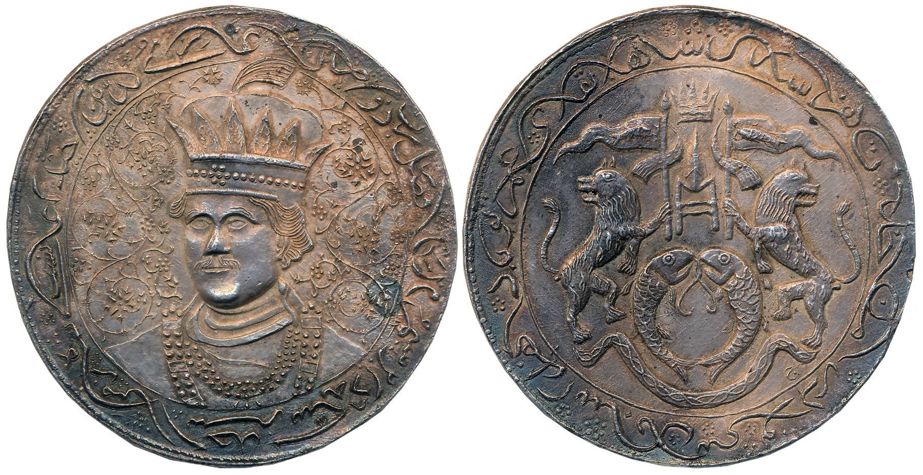 Awadh, Ghazi ud-Din Haidar, Silver Coronation Medal, 78.02g, Obv: Bust of king, three quarters profile in high relief, crowned and garlanded, background occupied by tracery of flowers, marginal Farsi legend in ornamental characters beginning under the king’s left shoulder “Sikkah zad bar seem wa az-fazl rab Dhu’l-muneen / Ghazi-ud-din Haider ala nasb Shah zaman, Sanah Ahd” (Struck coin on gold and silver by the grace of the great and Almighty God, Ghazi-ud-din Haidar, of lofty lineage, king of the world. Year one), Rev: Arms of the king in high relief within circular area. Two lions rampant holding flags on each of which appears a fish. Between them a dagger (katar) surmounted by a crown. Below the dagger two fishes forming a circle, head to head below streamer. Marginal legend in ornamental letters beginning opposite the right flag, “Ta-hazar sal shaha baqli umar tu bada; hazar sal bashai tu dar zaman Khuda” (O King! May your age last for a thousand years. May you live for a thousand years in the realm of God). Patinated, extremely fine+, exceedingly rare.
