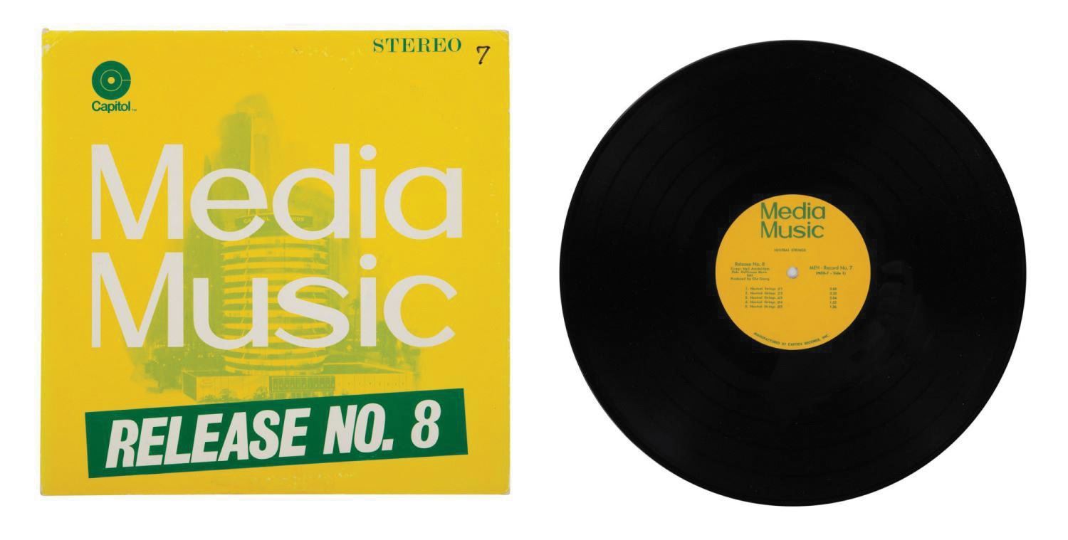 (Disneyland, c.1968) A rare Media Music recording featuring (10) tracks of "neutral strings," some of which were chosen by Jack Wagner to be utilized for the soundtrack of the PeopleMover at Disneyland and Walt Disney World. More than 17 minutes of music are contained on the double-sided album, each orchestrated by Neil Amsterdam, published by Dollhouse, and produced by Ole Georg for his Capitol Records 10-album series. Measuring 12" the 33 1/3 rpm record with sleeve displays in a very good condition, exhibiting few scratches and minor wear to sleeve and cover.