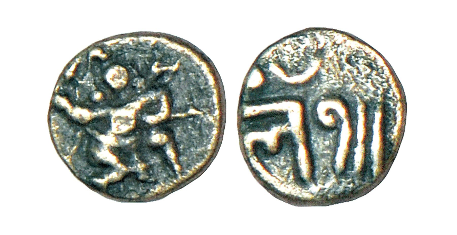 Abhiras of Bhambhagiri (Bhamer in Khandesh, Northern Maharashtra), Lakshmideva (1200-1250 AD), silver tara, unpublished in major sources, 0.21g. Obv: Warrior running to right. Rev: Representation of sun and moon, Nagari letter La and Kannada numeral 2.5.