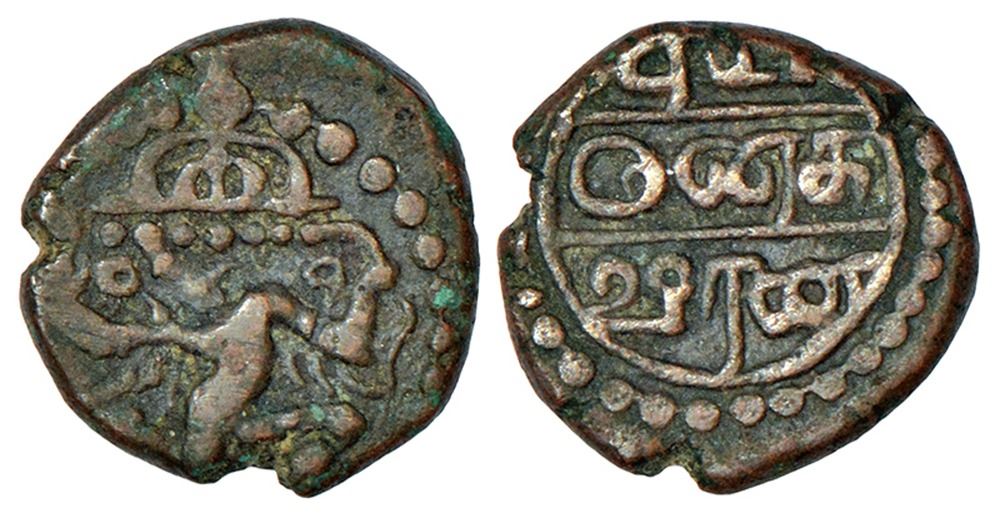 Banas of Madurai as feudatories of Vijayanagara - copper coin in the name of 'Bhuvaneka Veeran', (1450-1500 AD), Ganesh 'Tamilnadu' 8.11, 3.18g. Obv: Garuda running to right holding snake in extended hand, under an elaborate canopy (Chhatra). Rev: Tamil legend Puva/ neka/ Veeran in three lines in a dotted border.