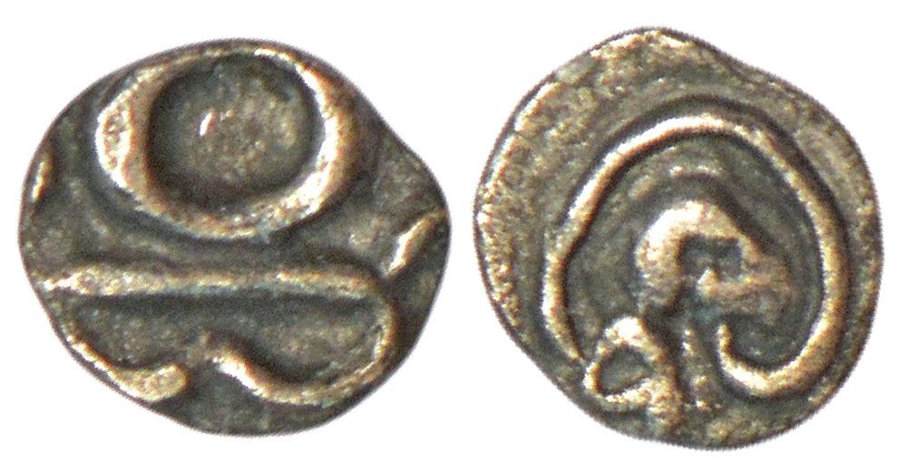 Chalukyas of Kalyani or feudatories - unattributed silver ¼ tara, (c.1100-1200 AD), unpublished in major sources, 0.11g. Obv: Kannada letter 'Ko'. Rev: Kannada letter 'Shri' 'Ko' probably stands as an initial of the name or title of the issuing