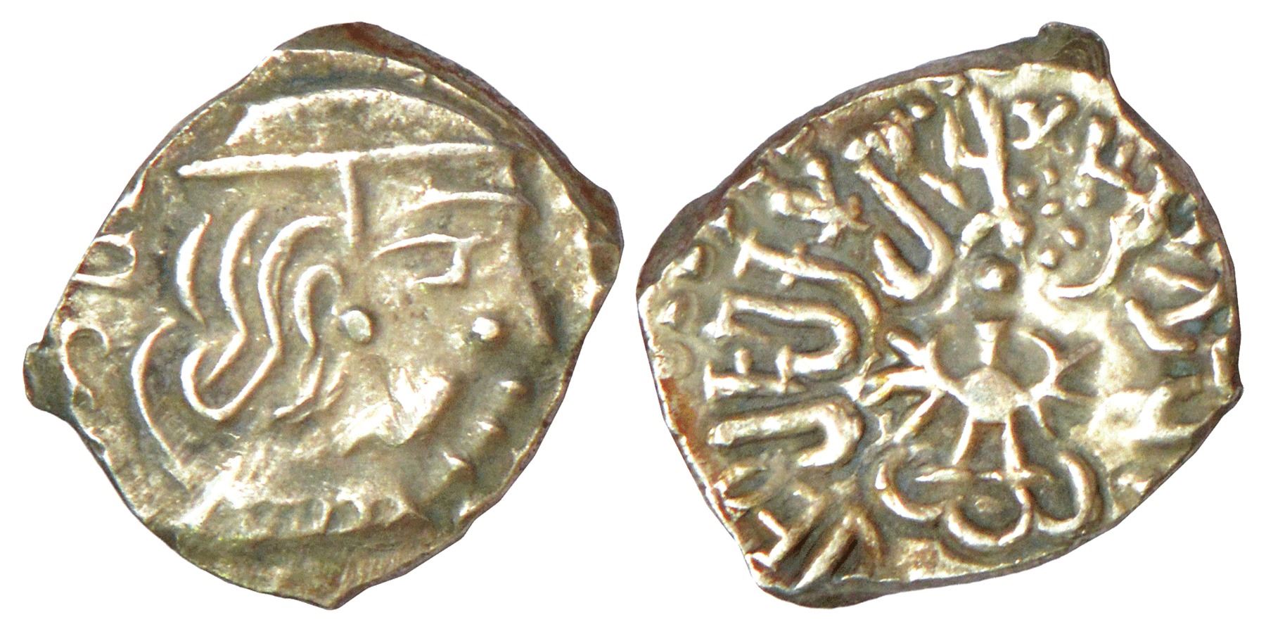 Gupta Empire - silver drachm of Kumara Gupta I (415-450 AD), 'Western India' type, dated GE11X, S Kumar Class I, 2.15g. Obv: Profile bust of king to right; date Va 100 + 10 + X in numerals written outwards behind head. Rev: Garuda emblem in centre, dotted sun to right; Brahmi legend …rajadhiraja Shri Kumara Gupta Mahendraditya around.