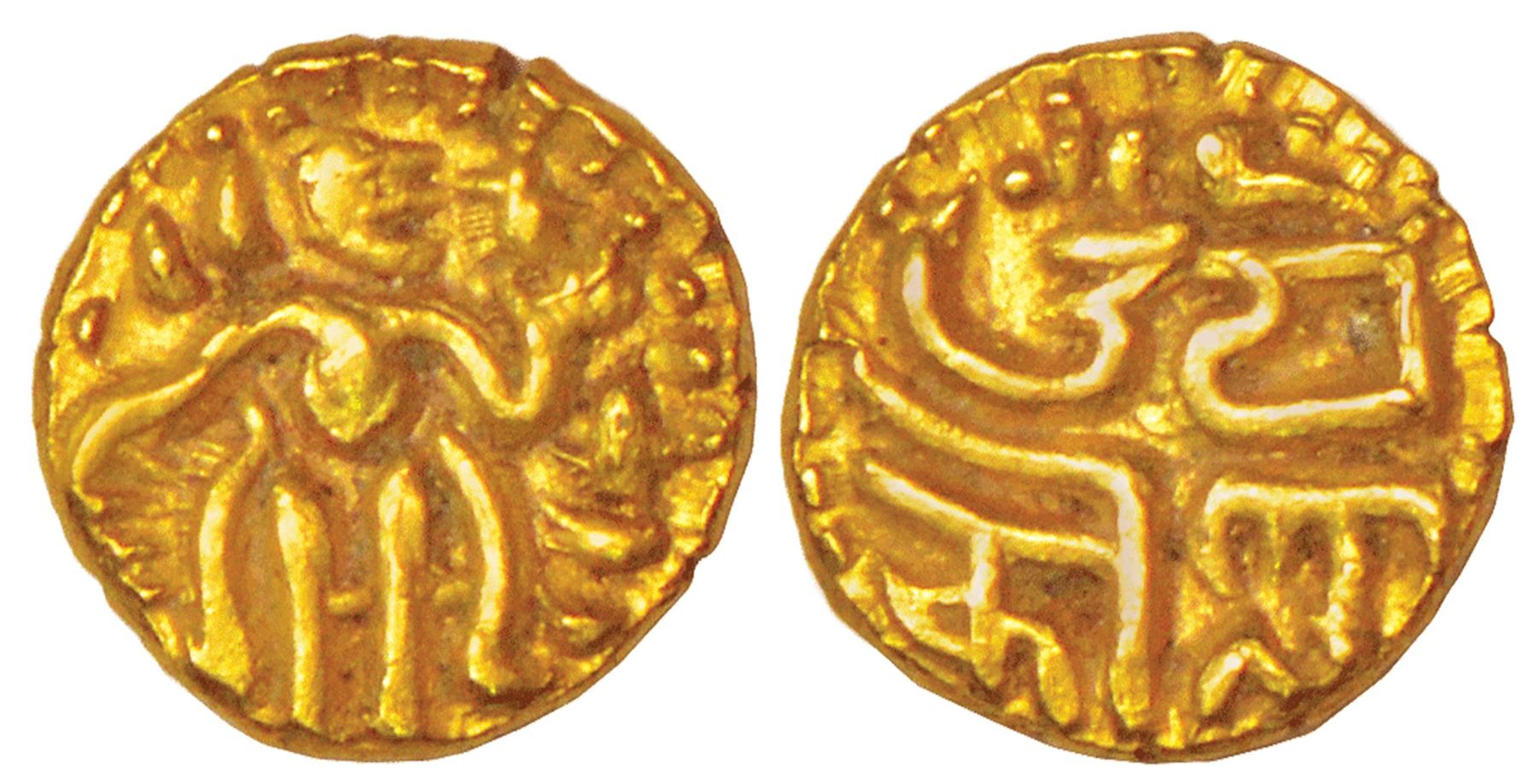 Imperial Cholas, gold kahavanu of Raja Raja I (985-1014 AD), K. Ganesh 1.8, 0.72g. Obv: King standing facing right. Rev: Devanagari legend Uya Konda in two lines, conch-shell on top.