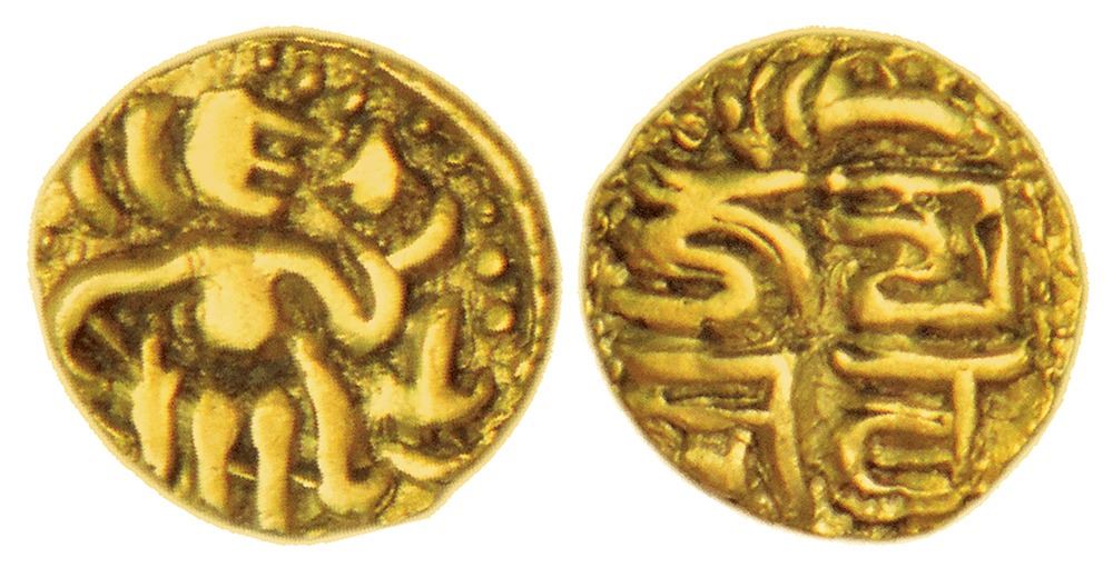 Cholas - gold 1/8 kahavanu attributed to Raja Raja I (985-1014 AD), K. Ganesh 'Tamilnadu' 1.8, 0.21g. Obv: standing human figure lifting one hand. Rev: Devanagari legend Jaya/Chola in two lines below a horizontal Shankha.
