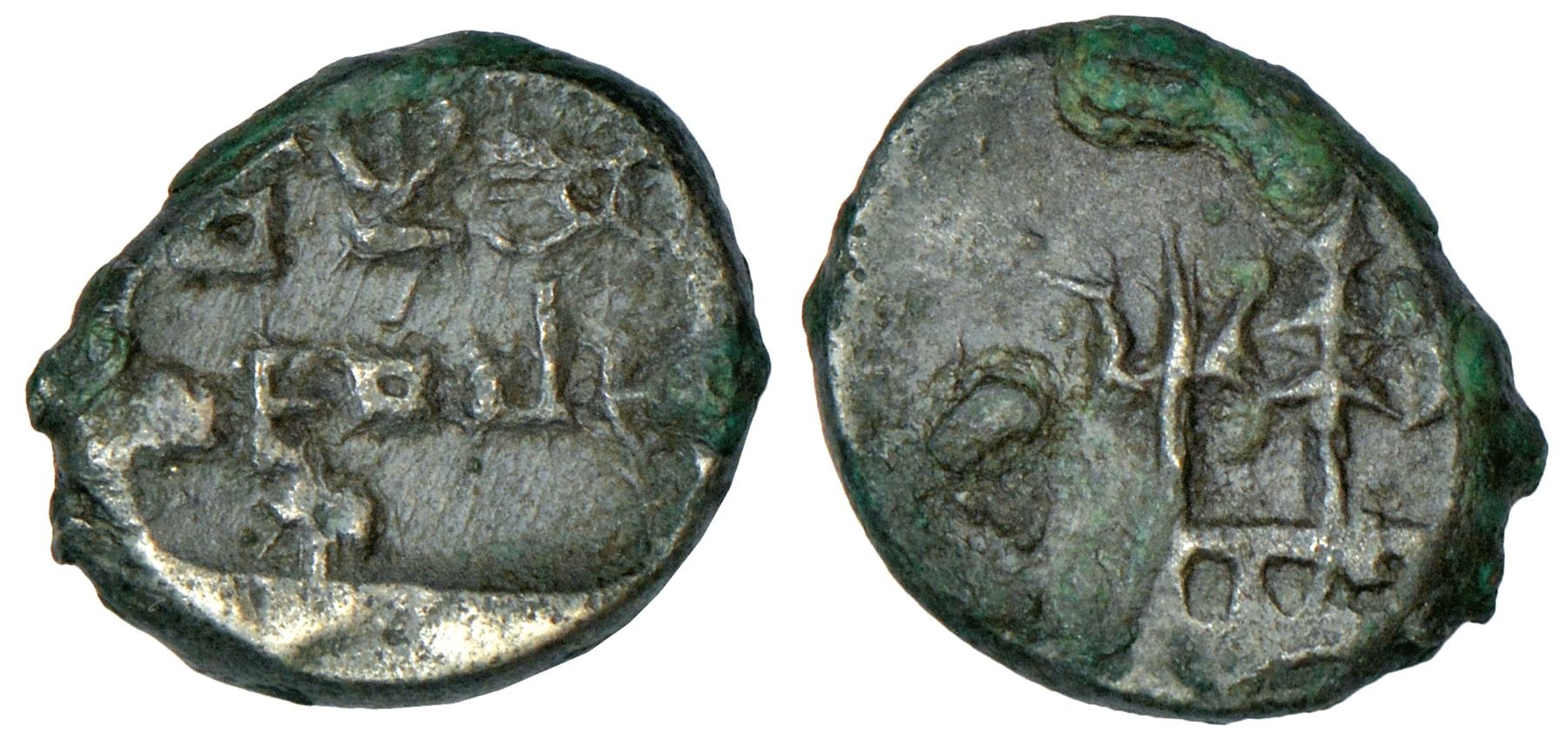Panchala, monarchical coinage - alloyed copper coin of Yajnabala, (c.100-200 AD), not listed in MAC, 2.63g. Obv: Rectangular incuse with three symbols and Brahmi legend Yajñabalasa below. Rev: Trident and Chhatra on a thin rectangular platform; traces of another symbol to extreme right.