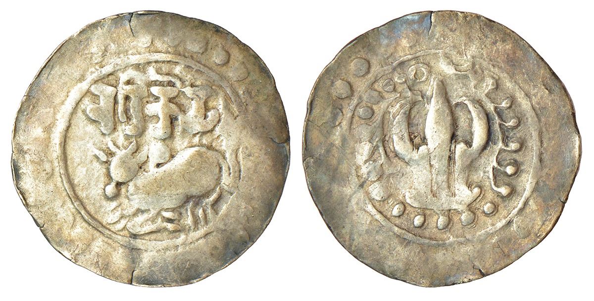 Medieval India: Eastern Bengal, Arakan region - silver unit of 'Harikela' type coinage (c.750-850 AD), MNC 503-505, 6.80g. Obv: recumbent bull facing left, Siddhamatrika legend Varikela above. Rev: ornate Shrivatsa symbol, surrounded by beaded garlands; crescent moon and sun above. (From the collection of Mr. I.K. Kejriwal)