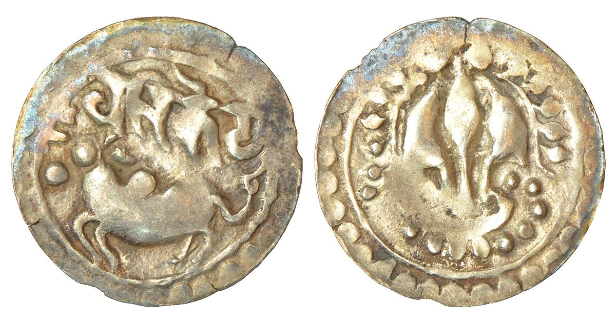 Medieval India: Eastern Bengal, Arakan region - silver unit of 'Harikela' type coinage (c.750-850 AD), MNC 503-505, 5.35g. Obv: recumbent bull facing left, Siddhamatrika legend Varikela above; crude figure of Sankha shell behind the bull's rump. Rev: ornate Shrivatsa symbol, surrounded by beaded garlands within dotted border. (From the collection of Mr. I.K. Kejriwal)