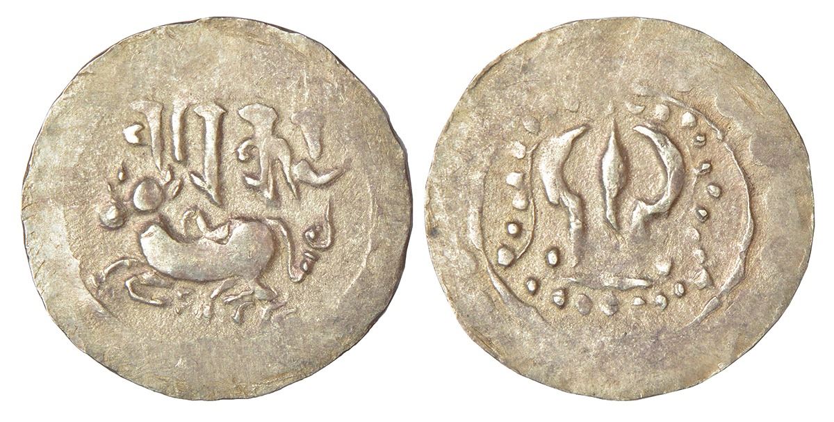 Medieval India: Eastern Bengal, Arakan region - silver unit of 'Harikela' type coinage (c.750-850 AD), MNC 503-505, 5.00g. Obv: recumbent bull facing left, Siddhamatrika legend Varikela above; crude figure of Sankha shell behind the bull's rump. Rev: ornate Shrivatsa symbol, surrounded by beaded garlands.