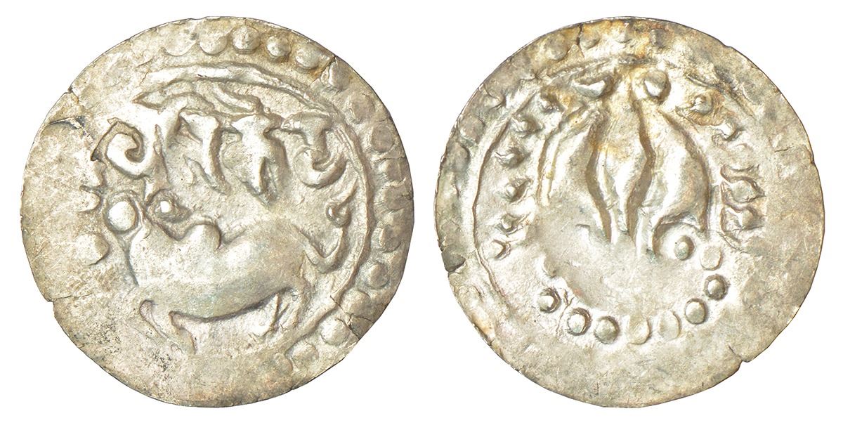 Medieval India: Eastern Bengal, Arakan region - silver unit of 'Harikela' type coinage (c.750-850 AD), MNC 503-505, 4.80g. Obv: recumbent bull facing left, Siddhamatrika legend Varikela above; crude figure of Sankha shell behind the bull's rump. Rev: ornate Shrivatsa symbol, surrounded by beaded garlands; traces of crescent moon and sun above. (From the collection of Mr. I.K. Kejriwal)