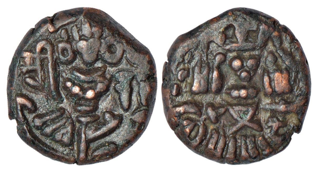 Hindu Kings of Kashmir, Vuppadeva dynasty - copper dinnara of Raja deva (c.1213-1235 AD), not listed in MNC, 5.28g. Obv: stylized representation of a seated goddess; Sarada legend Shri to left and Raja to right. Rev: stylized king standing facing slightly left, sacrificing over altar; traces of Sarada legend Deva below the folded arm.