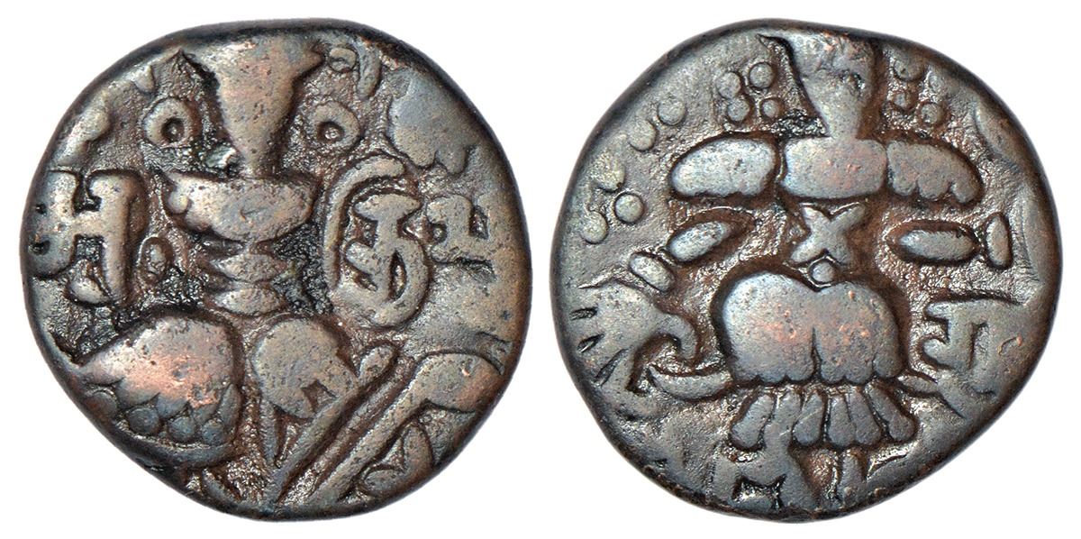 Hindu kings of Kashmir, Utpala dynasty - copper dinnara of Abhimanyugupta (958-972 AD), MNC 173, 5.22g. Obv: stylized representation of a seated goddess; Sarada legend A - bhima(nyu) divided by the figure on either side. Rev: stylized king standing facing left, sacrificing over altar; Sarada letter Gu below his arm.