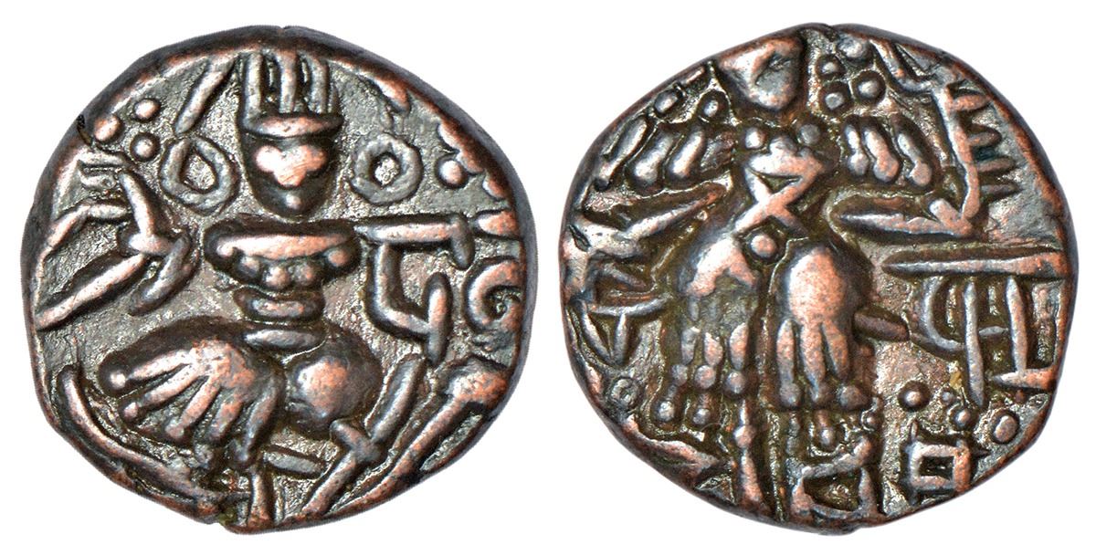 Hindu kings of Kashmir, Utpala dynasty - copper dinnara of Partha varman (906-921 and 934-935 AD), MNC 167-168, 6.22g. Obv: stylized goddess seated facing, wearing large earrings; Sarada legend Partha to right. Rev: stylized king standing facing left, sacrificing over altar; Sarada legend Varma below his arm.