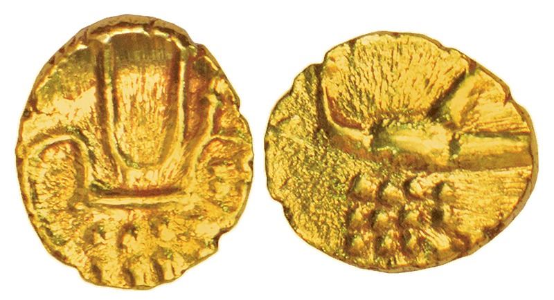 Medieval India: Hoysalas, gold fanam of Vira Raya, MCSI-I 324, 0.39g. Obv: Stylized lion standing right with crescent above. Rev: Crocodile.