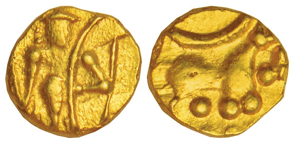 Hoysalas of Dwarasamudra - uninscribed gold fanam attributed to Vishnuvardhana II Bittiga (1106-1152), K. Ganesh 'Karnataka' #8.21, 0.41g. Obv: representation of Rama, standing facing, holding a large bow in one hand and an arrow in the other. Rev: stylized lion facing right with crescent above.