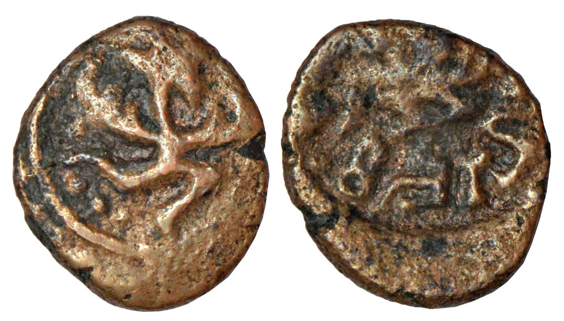 Pre-Gupta Central India, 'Garuda' type copper coin of Shridhara varma (300-350 AD), unlisted in major publications, 1.23g. Obv: Anthropoid Garuda running to right. Rev: Garuda seated cross-legged in centre (partly visible); Brahmi legend Maharajadhiraja… around.