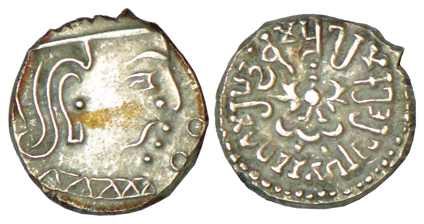 Gupta Empire, silver drachm of Kumara Gupta I (415-450 AD), 'Western India' type, not listed in S Kumar Class I, 2.20g. Obv: Profile bust of king to right. Rev: Garuda emblem in centre, dotted sun to right; truncated Brahmi legend inscribed in reverse sequence from 9 o'clock Parama-bhagavata Maharajadhiraja Shri Kumara Gupta Ma-dra-tya around.