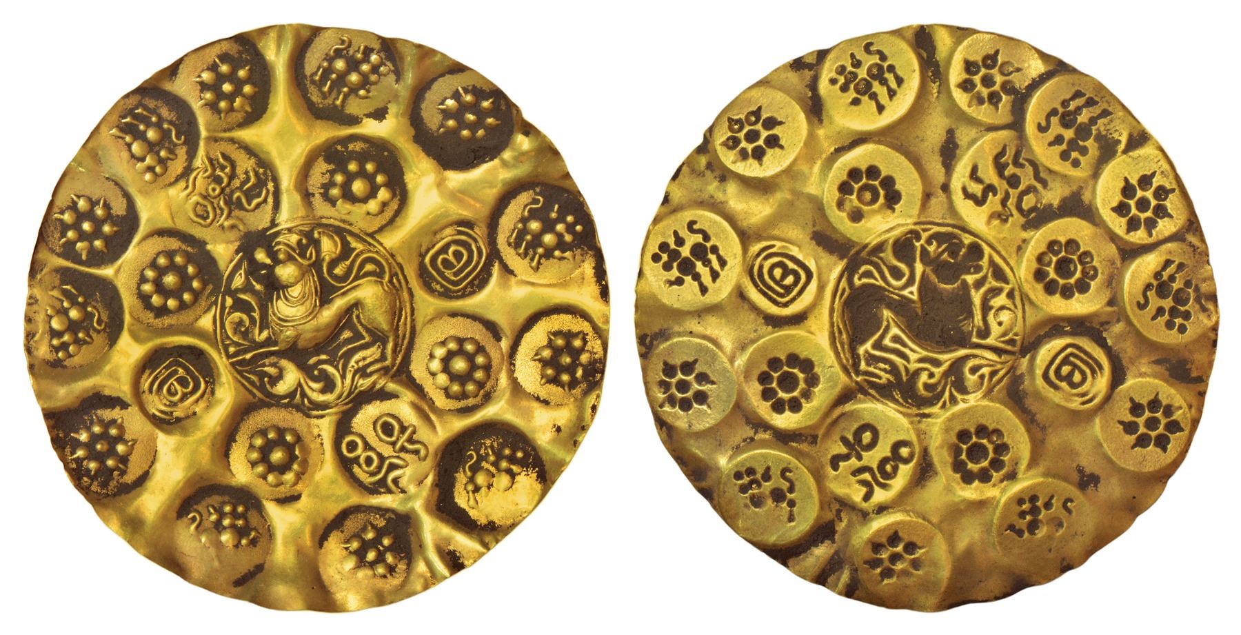 Kakatiyas of Warangal, Prola I (1052-1076 CE), Gold PMC, One-and-a-Half Gold Gadyana, Roaring Lion type, 5.87g, Height: 58.87mm, Width: 58.35mm. Total of 21 repousse punches elegantly struck on the obverse of a broad circular thin flan in three concentric tiers which is broader than the usual PMCs. This coin has a unique combination of Lion and Lotus punch sequences. 1x the central punch shows a majestic roaring lion facing left with floral ornamentations around. The peripheral punches are struck in two layers, the first tier surrounding the central punch consists of 8 punches: 2x Sri, 1x 'Raaya gaja', 1x ' Kesari' punches inscribed in Kannada, and 4x nine petalled Lotus symbol punches alternating between the legend punches. The outer tier consists of 12 punches: alternating 'Lion facing right' and Lotus symbol punches.
