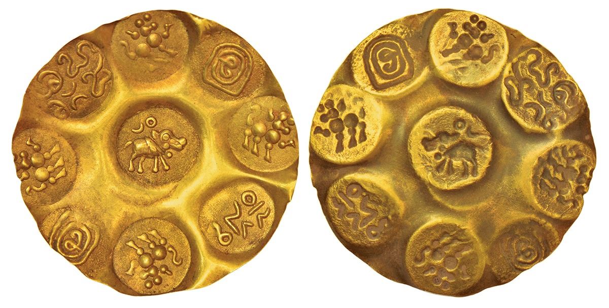 Kakatiyas of Warangal, gold punch-marked gadyana, repousse fabric (1100-1200 AD), 3.79g, Height: 36.48mm, Width: 36.76mm. Obv: Nine punches struck on a thin flan: 1x Boar to right with sun and moon on its back, 4x Lion to right