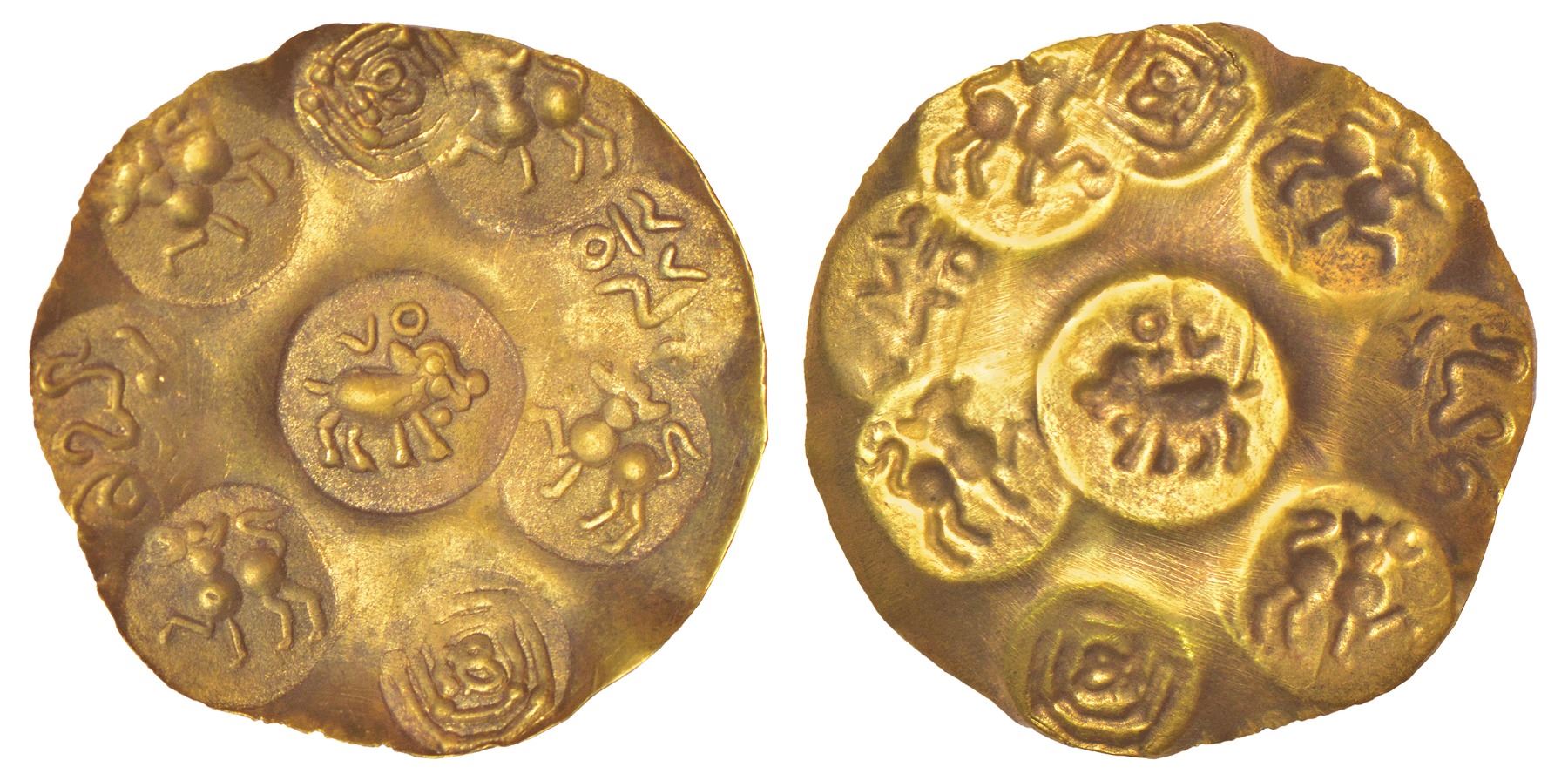Kakatiyas of Warangal, gold punch-marked gadyana, repousse fabric (c.1100-1200 AD), 3.78g. Obv: nine punches struck deeply on a very thin flan - a boar facing right with sun and moon above in the centre, 2x Kannada letter 'Shri', 4x lion facing left, 1x Kannada legend Ahi /(ta Gaja) and 1x Kannada legend Kesari. Width 31.85mm; Height 31.72mm.