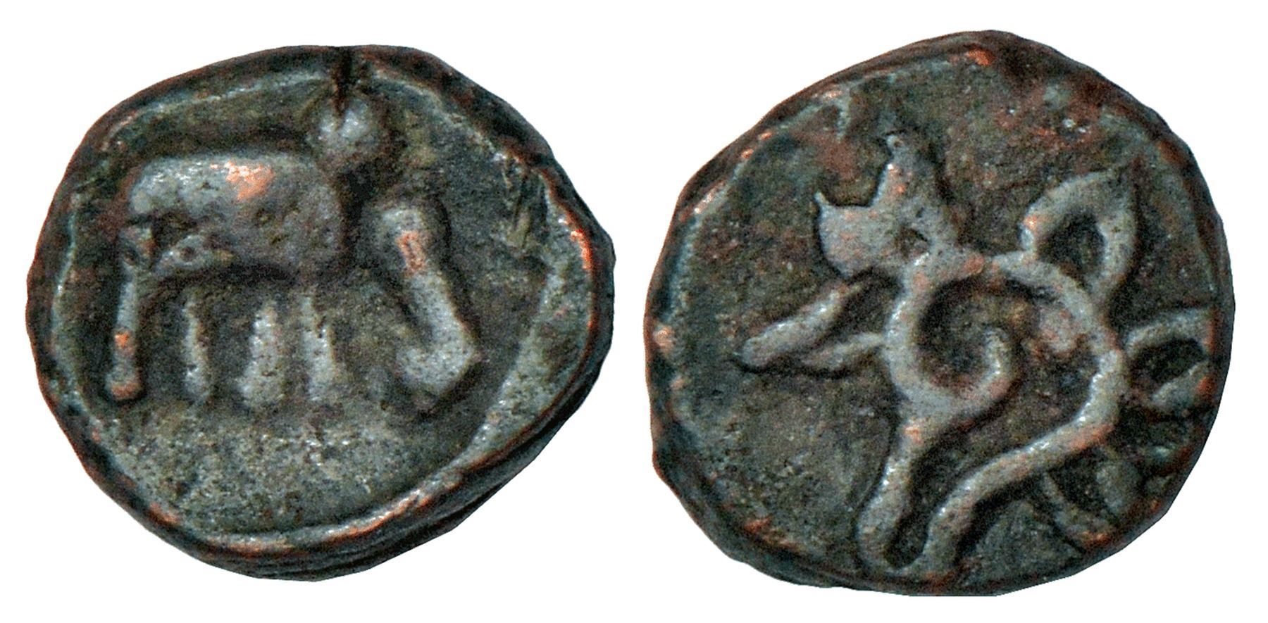 Karnataka, Tamilnadu borderlands, unattributable and uninscribed copper cash, most likely a Polygar issue struck during the Chandragiri Rajya period (1570-1630 AD), not listed in Ganesh or Mitchiner, 2.16g. Obv: Elephant facing right. Rev: Ornate representation of Conch shell (a Vaishnava emblem).