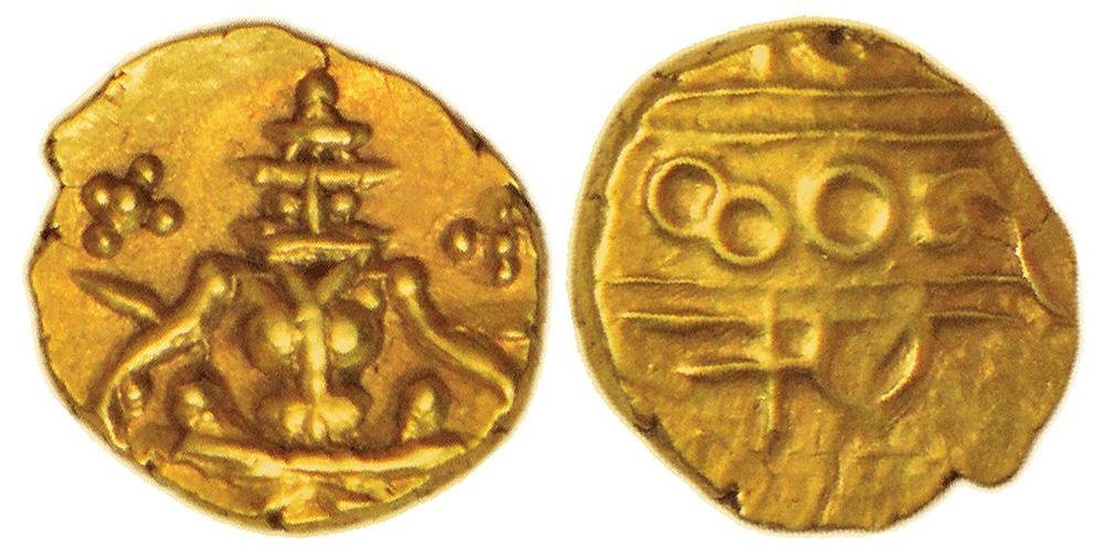 Kingdom of Mysore, gold fanam of Kanthirava Narasa Raya (1638-1662 AD), MCSI-I 910-911, 0.41g. Obv: Narasimha seated in Yogabandha posture. Rev: Crude Devanagari legend Shri Kanthi Rava in three lines.