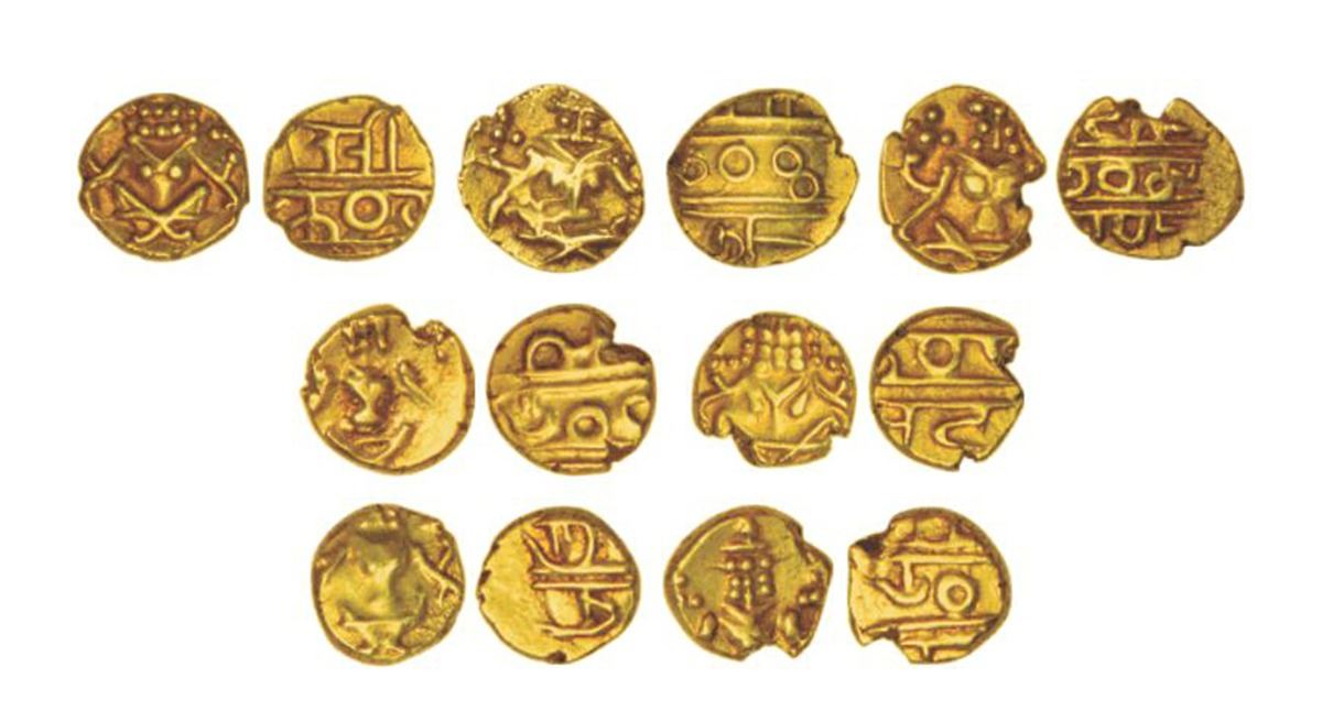 Kingdom of Mysore, seven gold fanams of Kanthirava Narasa Raya (1638-1662 AD), MCSI-I 910-911, 0.38g each. Obv: Narasimha seated in Yogabandha posture. Rev: Crude Devanagari legend Shri Kanthi Rava in three lines. (7 coins)