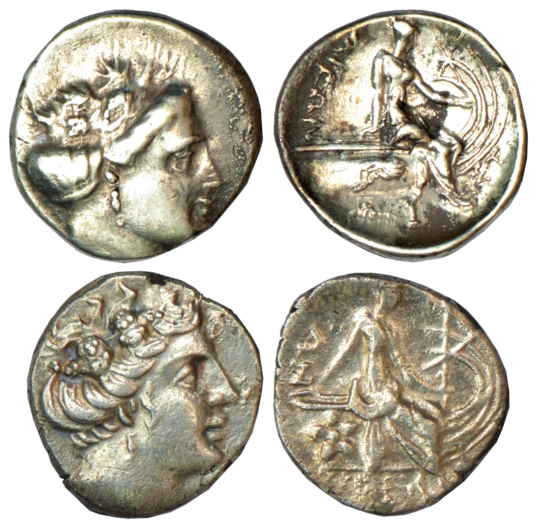 Euboia, Histaia, two silver tetrobols, (3rd-2nd cent. BC), BMC 64, 2.49g and 2.07g, respectively. Obv: Head of nymph Histaia right, wearing wreath of vine with grapes. Rev: Nymph Histaia seated right on stem of ship, Greek legend ISTAION in exergue. (2 coins)