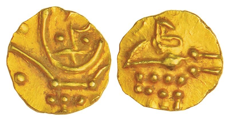 Medieval India: Marathas of Tanjore, gold fanam of Venkaji Ekoji (1674-1686 AD), M&W T1, 0.39g. Obv: Nagari Ve. Rev: Crocodile.