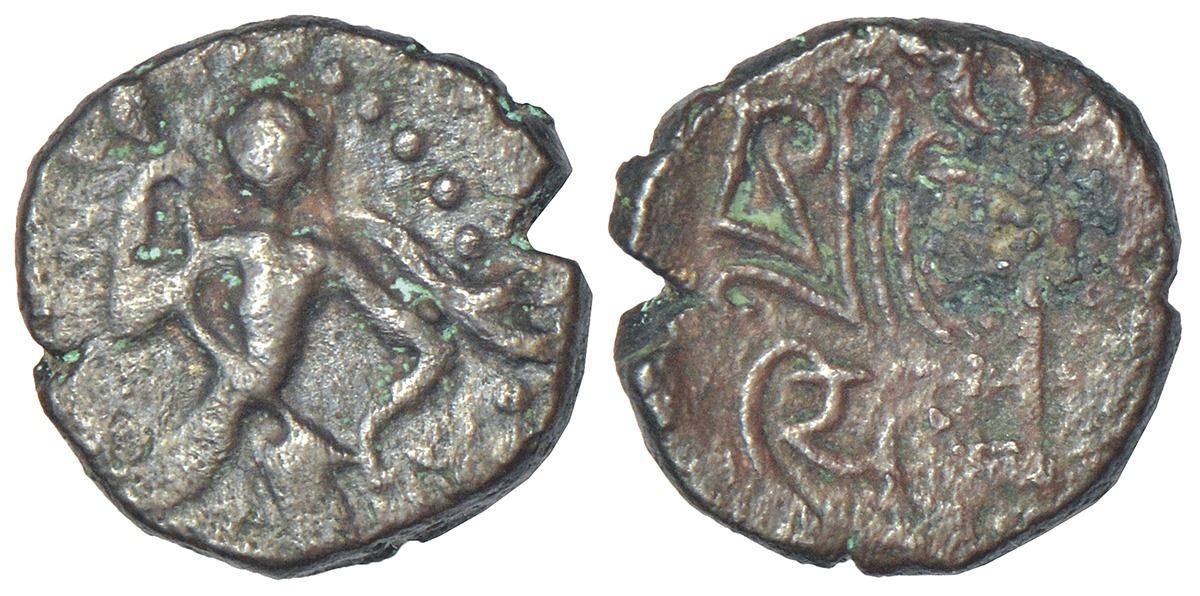 Medieval Gujarat - unattributed copper coin (700-800 AD), 1.98g. Obv: Figure of anthropomorphic Garuda flying to right, holding snake. Rev: Trident in the centre; Kutila legend Shri Vi? De… around.