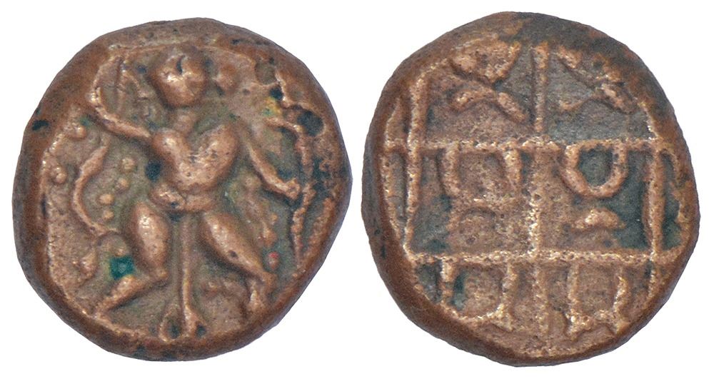 Nayakas in North Tamilnadu, Arani region - copper kasu, in the name of 'Venkata Raya', probably indicating Venkata Pati Raya II or III, latter Vijayanagara kings ruling from Penukonda, 3.16g. Obv: Hanuman in 'Vira' posture. Rev: Chequered pattern with each box enclosing Telugu/ Kannada letters of legend Shri Vengada Raya.