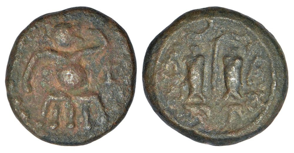 Pandyas of Madurai, copper coin of uncertain ruler, (1200-1300 AD), 3.38g. Obv: 'standing man' of Chola type. Rev: Pandya dynastic emblem of two fish with a crozier in between, traces of unreadable Tamil legend on either side.