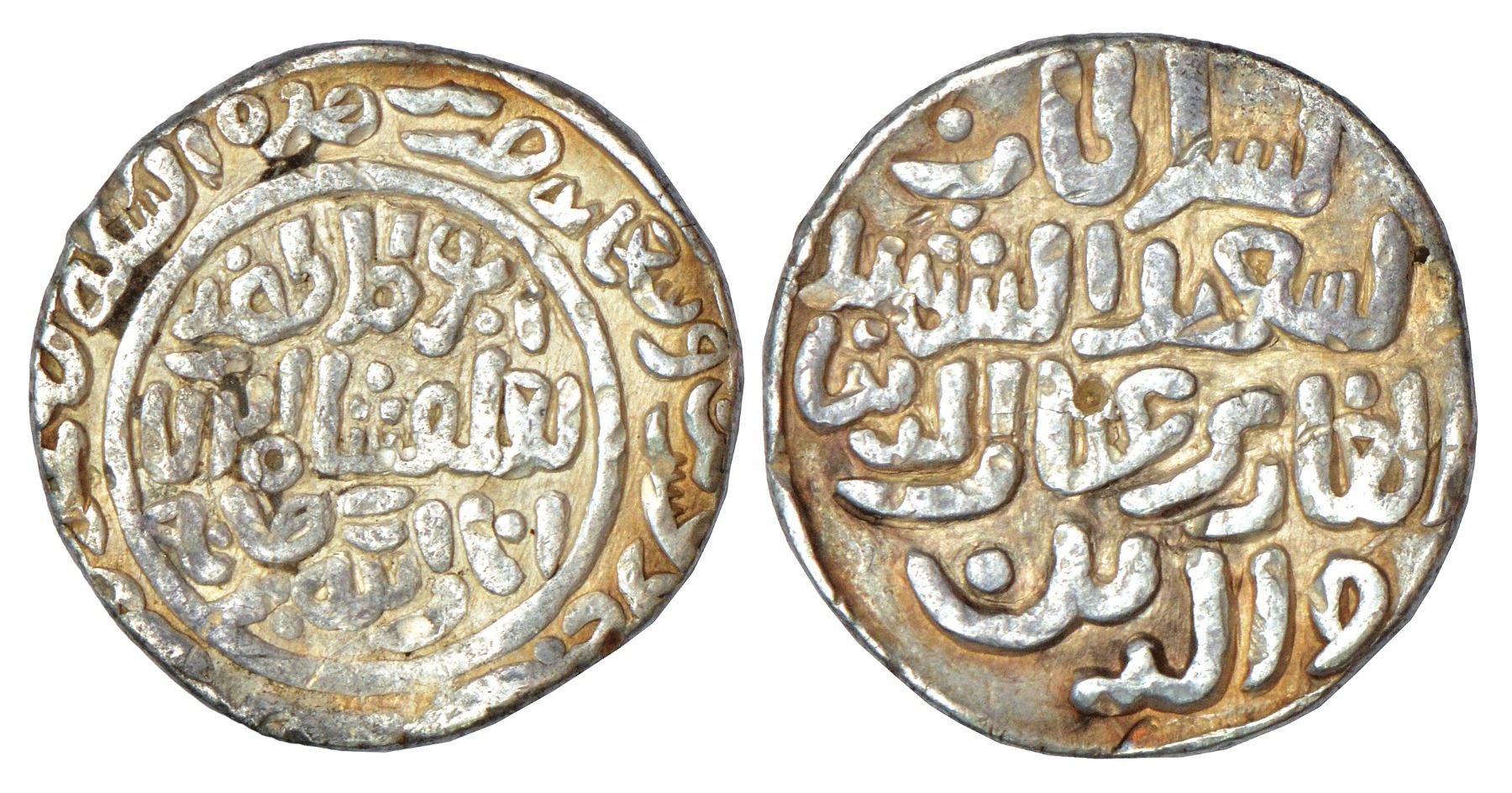 Sultans of Delhi - Tughluqs, silver tanka of Muhammad bin Tughluq (1325-1352 AD), struck in the name of his father 'Ghiyath al-din Tughluq', Baldat Qutbabad mint, AH 727, G&G D325, 10.85g. Obv: Abu al Muzaffar Tughluq Shah Anara Allah Burhanuhu in circle; mint name and AH date in margin. Rev: Arabic legend al-Sultan al-Sa'eed al--Shaheed al Ghazi Ghiyath al Dunya wa al-Din; flan little wavy.