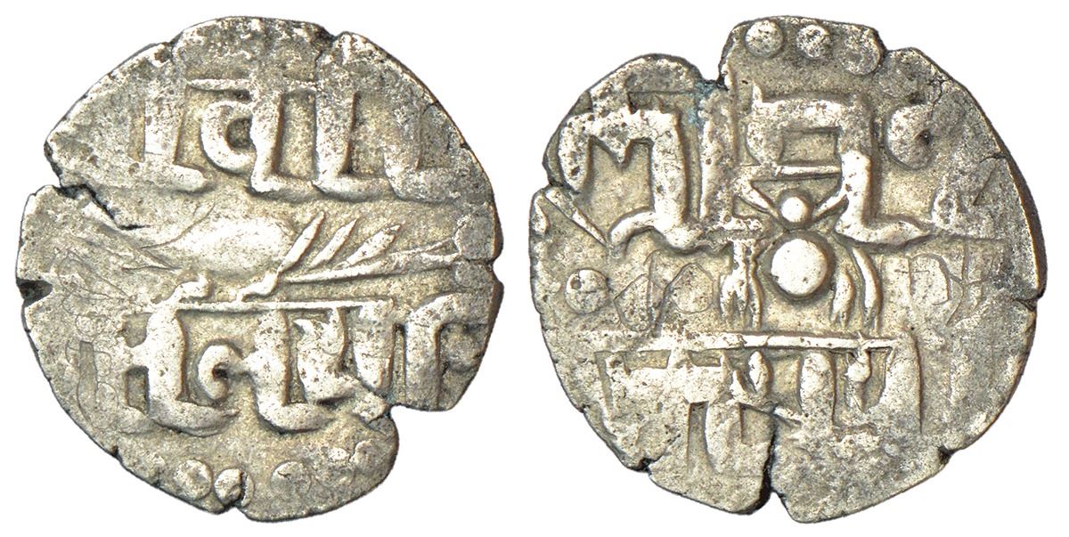 Perumal kings of Venad/Kerala, silver kasu of Vira Kerala (1118-1144 AD), MSCI 446, 2.50g. Obv: Crocodile in centre, Nagari legend Sri Vira/Keralasya above and below. Rev: Spider/flower in centre, Nagari legend Sri Ganda/rankushasya.