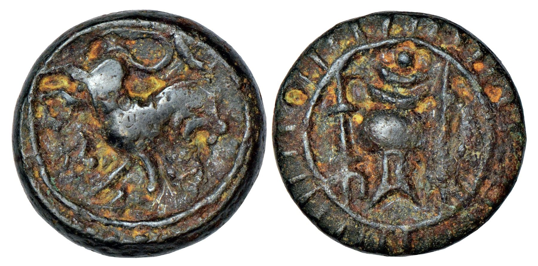 Vishnukundin dynasty, 'lion' type uninscribed coin of alloyed copper, (500-600 AD), 8.44g. Obv: Roaring lion with mane, facing right; crescent above. Rev: Kalasha (vase of plenty) on a pedestal between two lamp-stands, in a rayed circle.