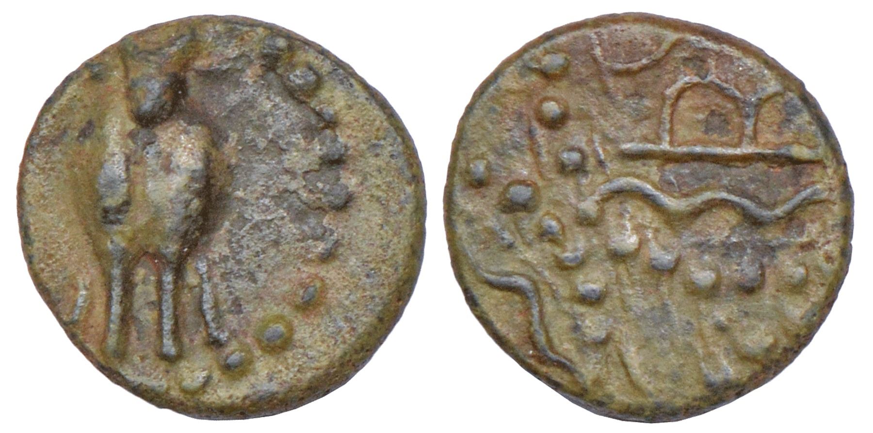 Western Kshatrapas, anonymous and uninscribed 'bull' type potin coin issued under Damasena or later (235 AD onwards), Fishman 24.8, 1.83g. Obv: Bull standing facing. Rev: Dynastic emblem within a dotted circle.