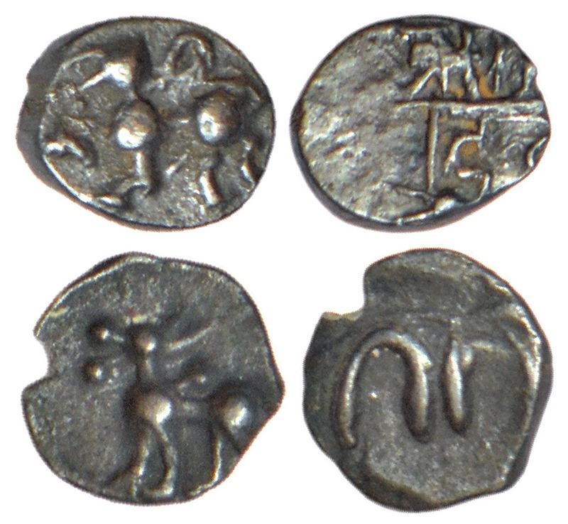 Medieval India: Two silver coins, (a) Yadavas of Devagiri - silver tara of Ramachandra (1275-1315 AD), not listed in MCSI, 0.22g. Obv: lion facing left. Rev: Devanagari legend Sri Ra(ma)/ Deva and (b) Vijayanagara feudatories, Chiefs of Haduvali / Nagire, South Coastal Karnataka - anonymous silver ¼ tara, (c.1400-1500 AD), 0.10g. Obv: bull facing left. Rev: Kannada numeral 1¼. (2 coins)