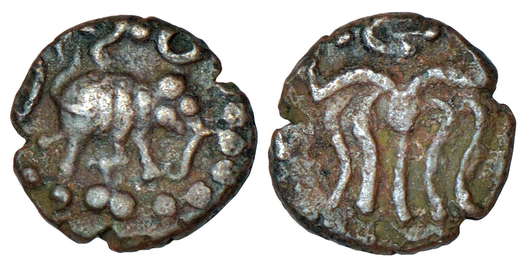 Viajayanagara Empire, local coinage in Sendamangalam region, Salem-Dindigul area, uninscribed copper coin attributed to Devaraya I/II (1400-1500 AD), 2.68g. Obv: Elephant running to right, vaishnavite symbols above. Rev: Chola-style 'standing man' design.