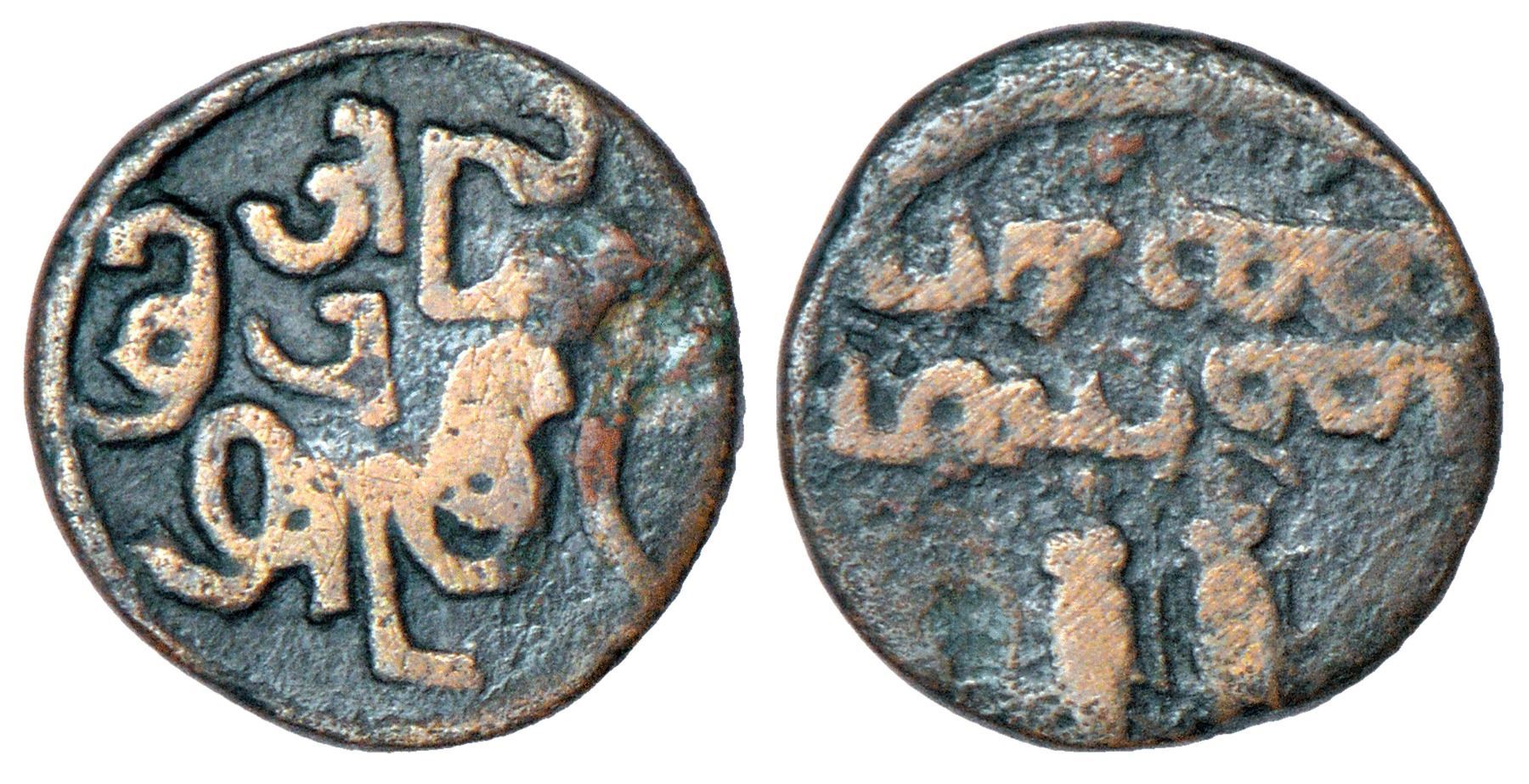 Vijayanagar Empire/Nayakas of Madurai, copper coin of Vishwanatha Nayaka (1529-1563 AD) as viceroy of Madurai, ruling on behalf of the titular Pandya king Chandrasekhara Parantaka, Ganesh 'Tamil nadu' no. 5.6, 2.66g. Obv: Crescent and tamil legend Viswanathan. Rev: Vertical pair of fish & tamil legend Pandiyan.