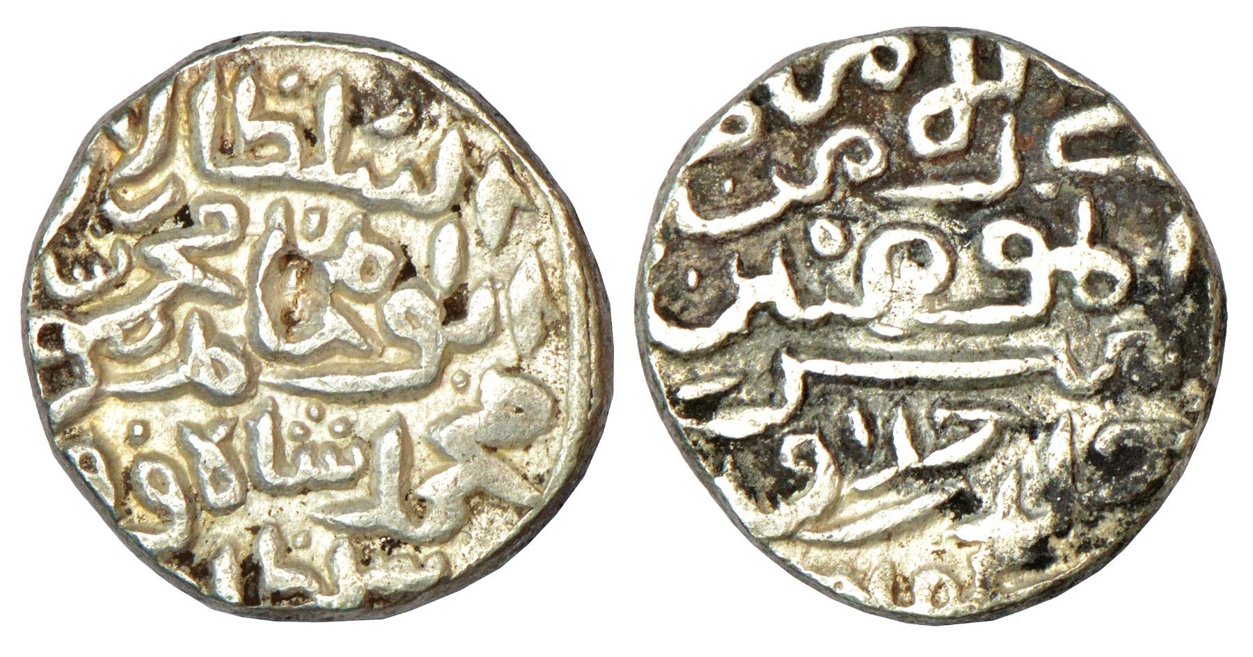 Sultans of Delhi - Tughluqs, silver tanka of Mahmud Shah Bin Muhammad (1393-1413 AD), AH 814, no mint type, G&G D624, 11.16g. Obv: Arabic legend al-Sultan al azam abu'l Muhamid Mahmud Shah Muhammad Shah Firuz Shah al sultani. Rev: Arabic legend Fi-zaman al imam amir al mu'minin Khulidat Khilafatuhu and date.